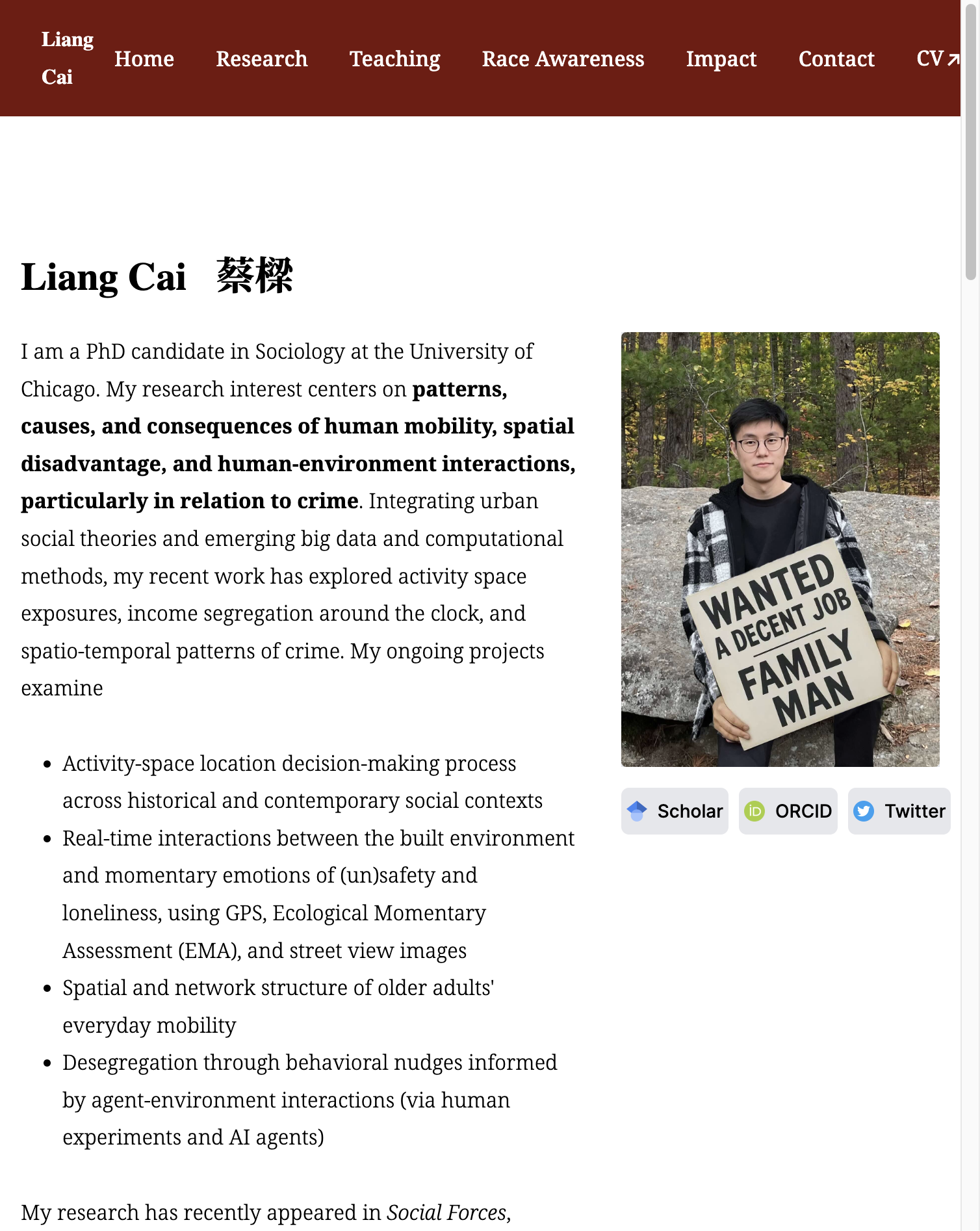 Personal site for a UChicago sociology Ph.D. candidate — research, teaching, publications, and contact.